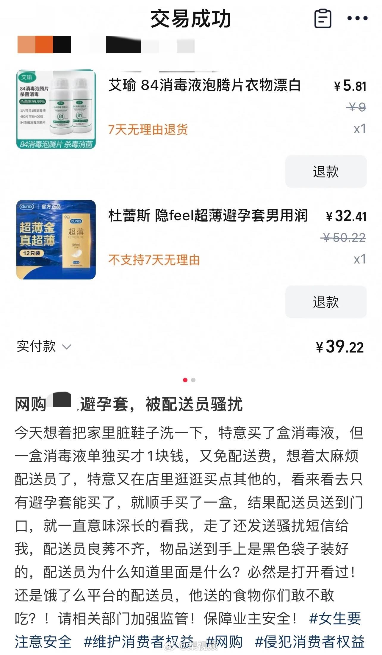 後續原PO表示,商家拒絕退貨退款,但平台介入後已經退款,同時也反應會加強保護用戶隱私問題。相關店家表示,已經看到外送員騷擾消費者一事,第一時間也聯絡了平台客服,稱已用黑色塑膠袋包裝商品,並將商品明細摺疊放入袋內,店家表示,外送員為何能看出產品訊息,可能是配送平台系統的關係。