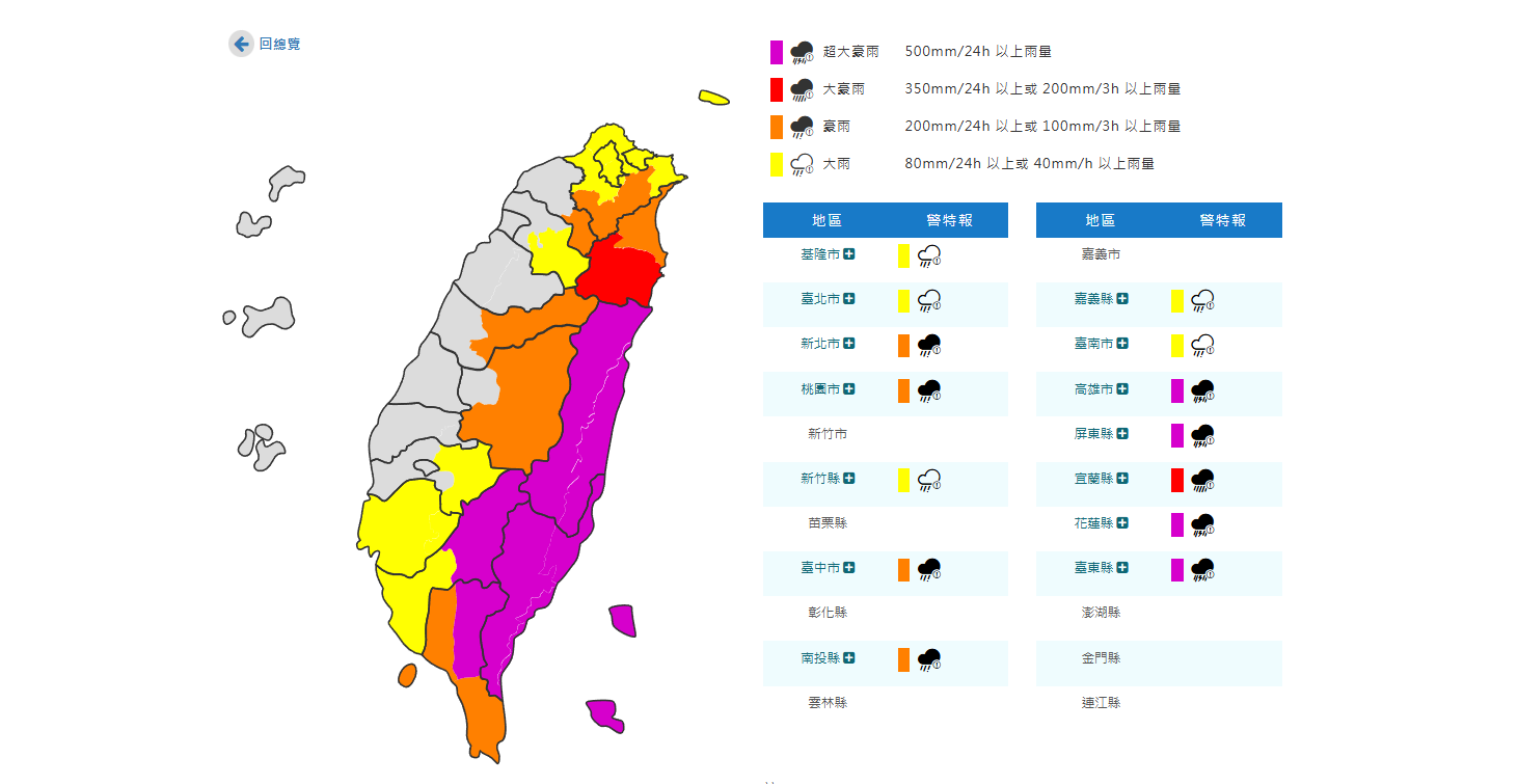 中央氣象署對14縣市發布超大豪雨、大豪雨、豪大雨特報。(圖/中央氣象署)