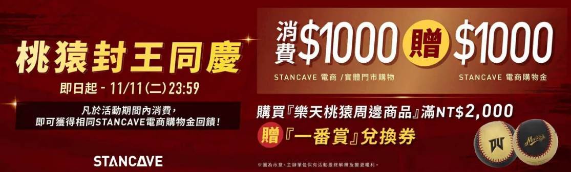 STANCAVE即日起至11/11全館不限商品,買多少STANCAVE就送多少購物金!購買樂天商品滿 2,000元再送實體一番賞兌換券。到門市抽簽名大獎!