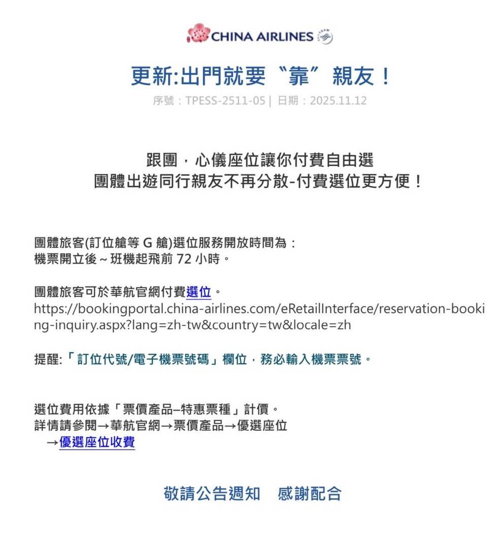 不少國人近年來都選擇出國旅遊,然而在搭機選位時,卻會面臨沒辦法與家人、好友同坐的情況。面對此需求,中華航空於12日發布公告,宣布將新增「團客付費選位」服務,而旅遊達人「蓋瑞哥」在臉書分享此消息,激讚「根本是德政」。