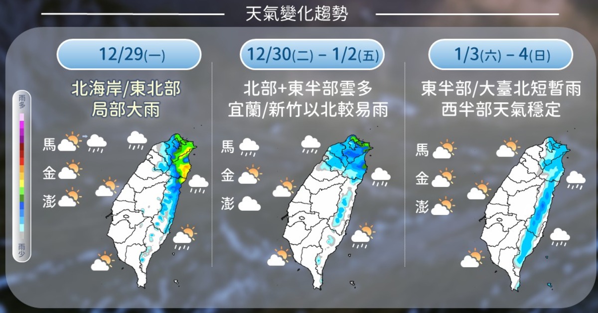 關於元旦後的天氣,中央氣象署表示,週五(2日)至週六(3日)冷氣團接力影響,各地氣溫進一步下降,台南以北及宜蘭低溫普遍下探11至14度,局部地區可能低於10度,花東及高屏地區低溫約14至16度,寒冷感受相當明顯,提醒民眾做好保暖準備。