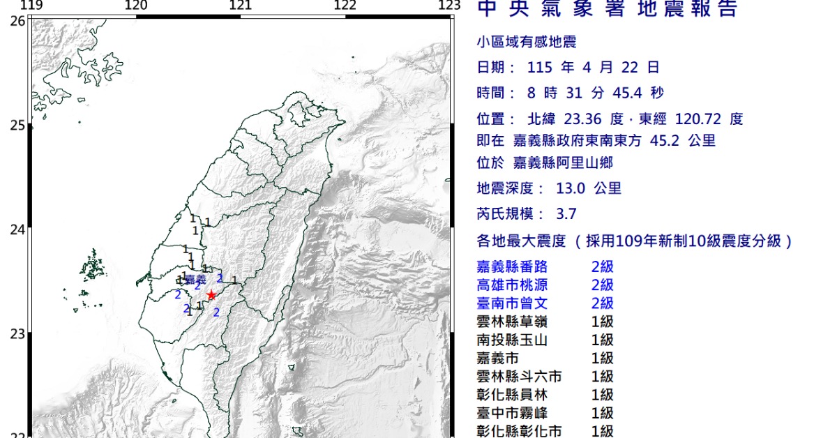 中央氣象署測定,今(22日)上午08:31嘉義縣政府東南東方45.2公里,阿里山鄉境內,發生規模3.7地震,地震深度13公里。